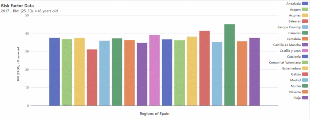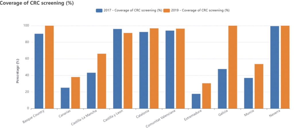 For the purposes of the study, a dedicated tab was developed on the DELI dashboard with visualisations of CRC data from the autonomous communities of Spain accessed through public databases. Specifically, we included data on CRC mortality, screening and prevalence of various risk factors (i.e. BMI, smoking, alcohol use, physical activity, poverty risk). The user was able to compare between autonomous communities and years. Some examples can be seen below.